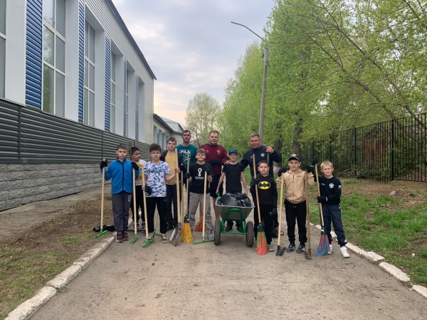 Спортсмены и тренеры тделения греко-римской борьбы вышли на территорию школы для того, чтобы собрать прошлогодние листья, мусор и привести в порядок выделенный участок.